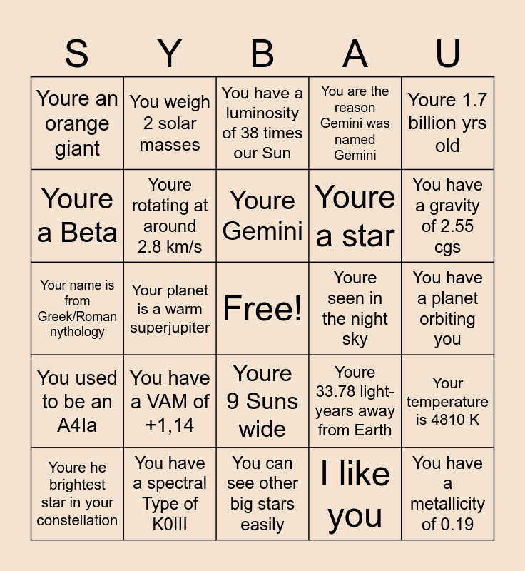 This bingo card has a free space and 24 words: You have a VAM of +1,14, You have a spectral Type of K0III, Youre Gemini, Youre he brightest star in your constellation, Youre 1.7 billion yrs old, Youre an orange giant, Youre a Beta, You weigh 2 solar masses, Youre seen in the night sky, Youre 9 Suns wide, Youre a star, Your name is from Greek/Roman nythology, Youre 33.78 light-years away from Earth, Your temperature is 4810 K, Youre rotating at around 2.8 km/s, I like you, You have a planet orbiting you, You have a luminosity of 38 times our Sun, You have a gravity of 2.55 cgs, Your planet is a warm superjupiter, You have a metallicity of 0.19, You used to be an A4Ia, You are the reason Gemini was named Gemini and You can see other big stars easily.