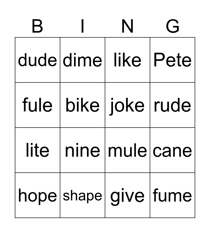This bingo card has 16 words: shape, cane, like, dude, lite, dime, mule, give, fule, bike, hope, Pete, nine, rude, joke and fume.