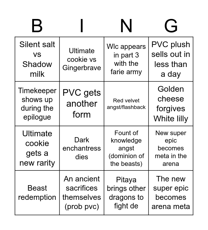 This bingo card has 17 words: Pitaya brings other dragons to fight de, Beast redemption, Wlc appears in part 3 with the farie army, Silent salt vs Shadow milk, Dark enchantress dies, PVC plush sells out in less than a day, New super epic becomes meta in the arena, Red velvet angst/flashback, Golden cheese forgives White lilly, PVC gets another form, An ancient sacrifices themselves (prob pvc), Fount of knowledge angst (dominion of the beasts), Timekeeper shows up during the epilogue, Ultimate cookie vs Gingerbrave, Ultimate cookie gets a new rarity, Crazy plot twist and The new super epic becomes arena meta.
