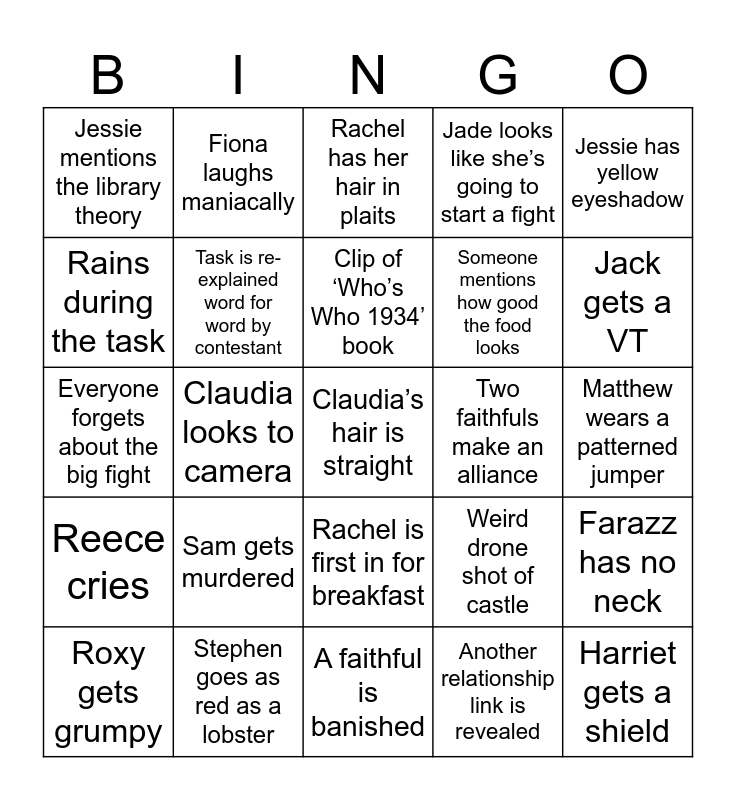 This bingo card has a free space and 24 words: Sam gets murdered, Stephen goes as red as a lobster, Clip of ‘Who’s Who 1934’ book, Roxy gets grumpy, Jessie has yellow eyeshadow, Jessie mentions the library theory, Rains during the task, Fiona laughs maniacally, Two faithfuls make an alliance, Rachel is first in for breakfast, Someone mentions how good the food looks, Everyone forgets about the big fight, Weird drone shot of castle, Farazz has no neck, Task is re-explained word for word by contestant, Another relationship link is revealed, Matthew wears a patterned jumper, Rachel has her hair in plaits, Jack gets a VT, Claudia looks to camera, Harriet gets a shield, Reece cries, Jade looks like she’s going to start a fight and A faithful is banished.