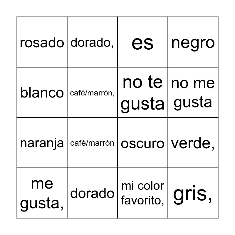 This bingo card has 46 words: azul, café/marrón, rojo, verde, amarillo, anaranjado, no te gusta, te gusta, rosado, morado, oscuro, negro, me gusta, plateado, arco iris, gris, blanco, dorado, mi color favorito, no me gusta, naranja, Los colores, es, verde,, azul,, café/marrón,, rojo,, te gusta,, amarillo,, anaranjado,, no te gusta,, negro,, rosado,, morado,, oscuro,, gris,, me gusta,, plateado,, arco iris,, no me gusta,, blanco,, dorado,, mi color favorito,, naranja,, Los colores and es.