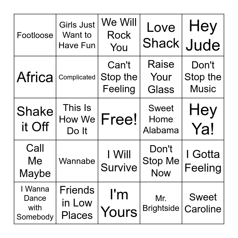 This bingo card has a free space and 43 words: Don't Stop Believin', Sweet Caroline, Livin' On a Prayer, I Wanna Dance with Somebody, Bohemian Rhapsody, Mr. Brightside, We Will Rock You, Dancing Queen, Hey Jude, Friends in Low Places, Love Shack, Sweet Home Alabama, I Will Survive, Wannabe, Uptown Funk, I'm Yours, September, Shake it Off, Happy, Don't Stop the Music, Girls Just Want to Have Fun, Take Me Home, Country Roads, Piano Man, Footloose, I'm Gonna Be (500 Miles), Hey Ya!, Walking on Sunshine, Firework, Don't Stop Me Now, Call Me Maybe, We Are Family, I Gotta Feeling, Ain't No Mountain High Enough, This Is How We Do It, Party in the USA, Roar, RESPECT, Can't Stop the Feeling, Africa, Raise Your Glass, Jessie's Girl, Complicated and Bad Day.