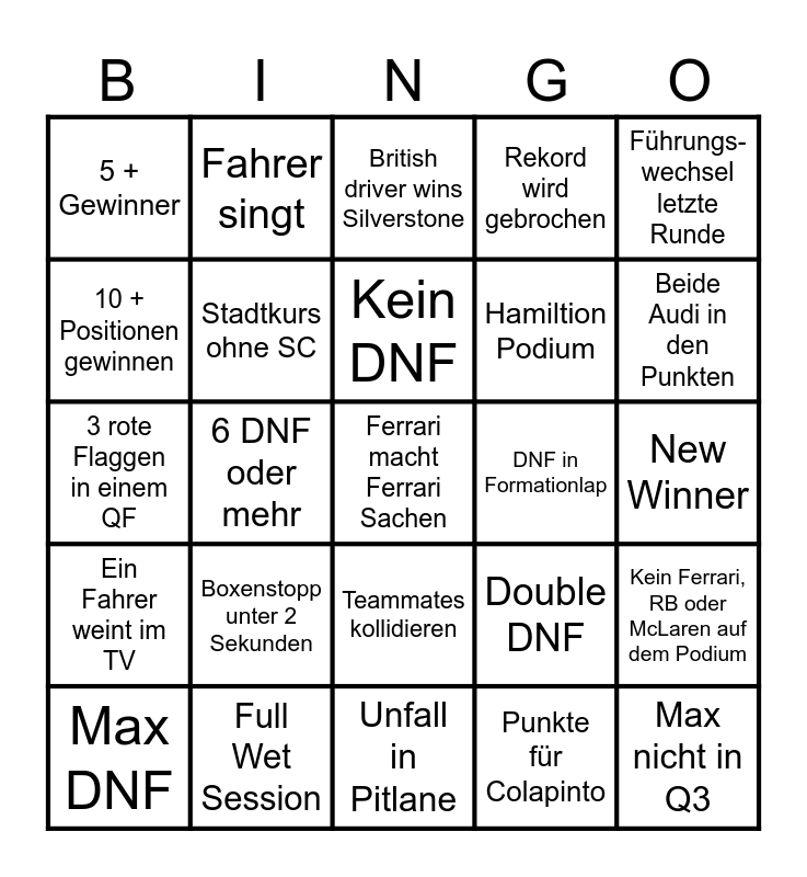 This bingo card has a free space and 29 words: Max DNF, Cadillac Top 5, 6 DNF oder mehr, Rennen endet unter SC, 5 + Gewinner, British driver wins Silverstone, Stadtkurs ohne SC, Boxenstopp unter 2 Sekunden, DNF in Formationlap, Full Wet Session, New Winner, Max nicht in Q3, Unfall in Pitlane, Punkte für Colapinto, Beide Audi in den Punkten, Auto liegt auf dem Dach, Teammates kollidieren, Ein Fahrer weint im TV, Führungs-wechsel letzte Runde, 3 rote Flaggen in einem QF, Double DNF, Leclerc in Top 3 in Tabelle, Hamiltion Podium, 10 + Positionen gewinnen, Rekord wird gebrochen, Fahrer singt, Kein Ferrari, RB oder McLaren auf dem Podium, Kein DNF and Schwarze Flagge.