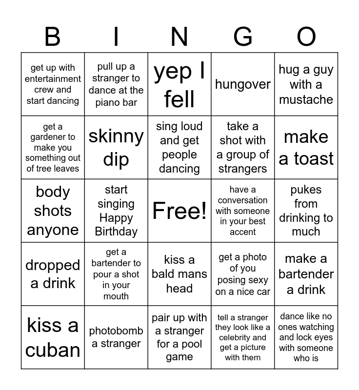 This bingo card has a free space and 24 words: get a bartender to pour a shot in your mouth, photobomb a stranger, sing loud and get people dancing, kiss a cuban, hug a guy with a mustache, get up with entertainment crew and start dancing, get a gardener to make you something out of tree leaves, pull up a stranger to dance at the piano bar, have a conversation with someone in your best accent, kiss a bald mans head, take a shot with a group of strangers, body shots anyone, get a photo of you posing sexy on a nice car, make a bartender a drink, skinny dip, tell a stranger they look like a celebrity and get a picture with them, pukes from drinking to much, yep I fell, make a toast, start singing Happy Birthday, dance like no ones watching and lock eyes with someone who is, dropped a drink, hungover and pair up with a stranger for a pool game.