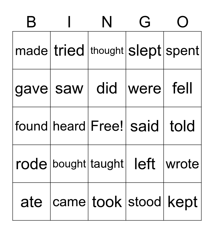 This bingo card has a free space and 24 words: bought, came, did, ate, spent, made, gave, tried, said, taught, were, found, left, wrote, saw, stood, told, thought, fell, heard, kept, rode, slept and took.
