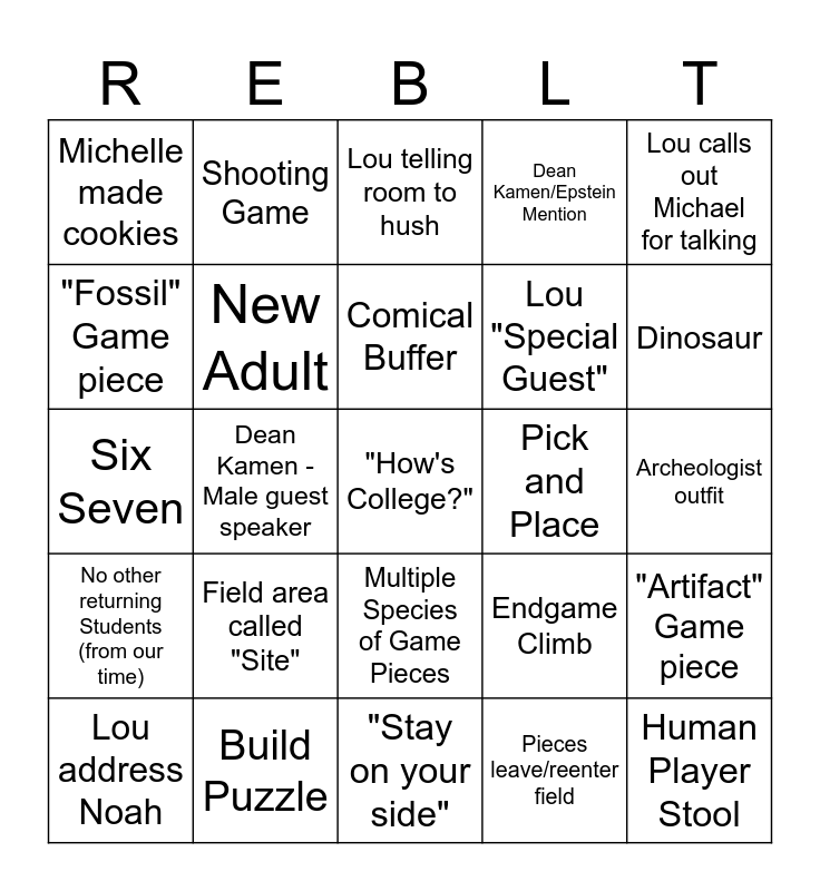 This bingo card has a free space and 24 words: Field area called "Site", Build Puzzle, Comical Buffer, Lou address Noah, Lou calls out Michael for talking, Michelle made cookies, "Fossil" Game piece, Shooting Game, Pick and Place, Multiple Species of Game Pieces, Lou "Special Guest", Six Seven, Endgame Climb, "Artifact" Game piece, New Adult, Pieces leave/reenter field, Archeologist outfit, Lou telling room to hush, Dinosaur, Dean Kamen - Male guest speaker, Human Player Stool, No other returning Students (from our time), Dean Kamen/Epstein Mention and "Stay on your side".