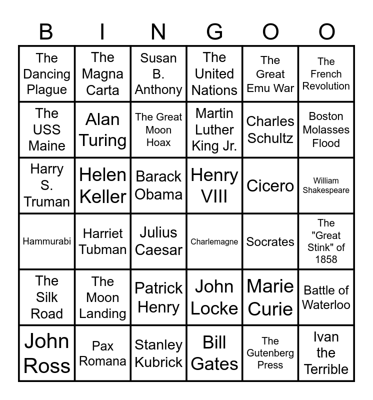 This bingo card has 48 words: Napoleon Bonaparte, Harry S. Truman, Joan of Arc, Socrates, Cicero, John Locke, The Magna Carta, The Black Plague, The French Revolution, Pax Romana, The USS Maine, The United Nations, Harriet Tubman, Hammurabi, Ivan the Terrible, Patrick Henry, Alan Turing, Helen Keller, Free!, The Great Emu War, Boston Molasses Flood, The "Great Stink" of 1858, The Dancing Plague, The Great Moon Hoax, William Churchill, Martin Luther King Jr., Julius Caesar, Mansa Musa, William Shakespeare, Henry VIII, The Renaissance, The Moon Landing, The Gutenberg Press, Nikola Tesla, Charlemagne, Stanley Kubrick, Bill Gates, Barack Obama, John Ross, Amelia Earhart, Marie Curie, The Silk Road, Susan B. Anthony, Great Fire of Rome, Charles Schultz, Battle of Thermopylae, Battle of Waterloo and Battle of Gettysburg.