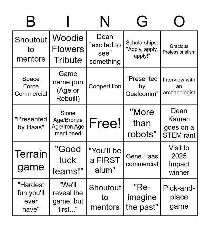 This bingo card has a free space and 24 words: "Good luck teams!", "We'll reveal the game, but first...", Coopertition, "Hardest fun you'll ever have", Gracious Professionalism, Shoutout to mentors, Space Force Commercial, Woodie Flowers Tribute, "More than robots", "You'll be a FIRST alum", "Presented by Qualcomm", "Presented by Haas", Gene Haas commercial, Visit to 2025 Impact winner, Game name pun (Age or Rebuilt), "Re-imagine the past", Dean Kamen goes on a STEM rant, Dean "excited to see" something, Interview with an archaeologist, Stone Age/Bronze Age/Iron Age mentioned, Pick-and-place game, Terrain game, Scholarships: "Apply, apply, apply!" and Shoutout to mentors.