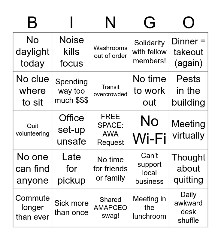 This bingo card has a free space and 24 words: Late for pickup, Sick more than once, Transit overcrowded, Commute longer than ever, Dinner = takeout (again), No daylight today, No clue where to sit, Noise kills focus, No Wi-Fi, No time for friends or family, No time to work out, Quit volunteering, Can’t support local business, Thought about quitting, Spending way too much $$$, Meeting in the lunchroom, Meeting virtually, Washrooms out of order, Pests in the building, Office set-up unsafe, Daily awkward desk shuffle, No one can find anyone, Solidarity with fellow members! and Shared AMAPCEO swag!.