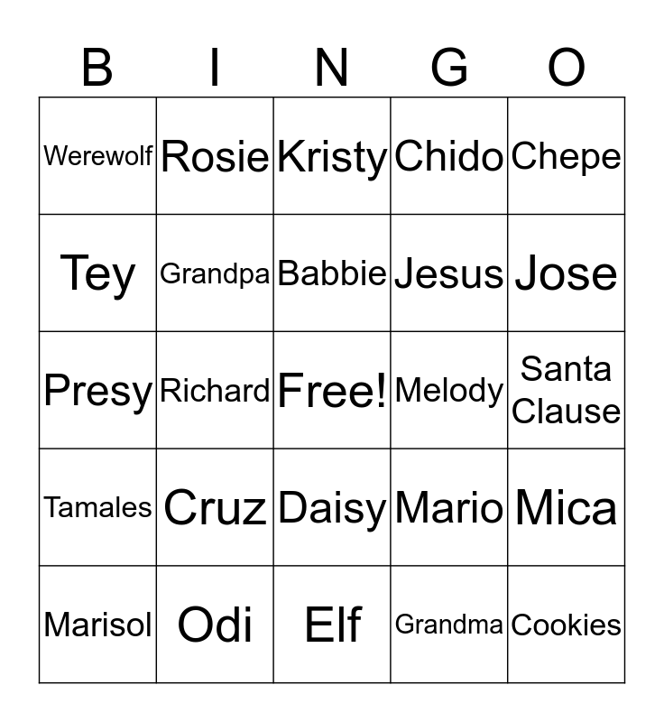 This bingo card has a free space and 24 words: Cruz, Odi, Babbie, Marisol, Chepe, Werewolf, Tey, Rosie, Melody, Daisy, Jesus, Presy, Mario, Mica, Grandpa, Grandma, Santa Clause, Kristy, Jose, Richard, Cookies, Tamales, Chido and Elf.