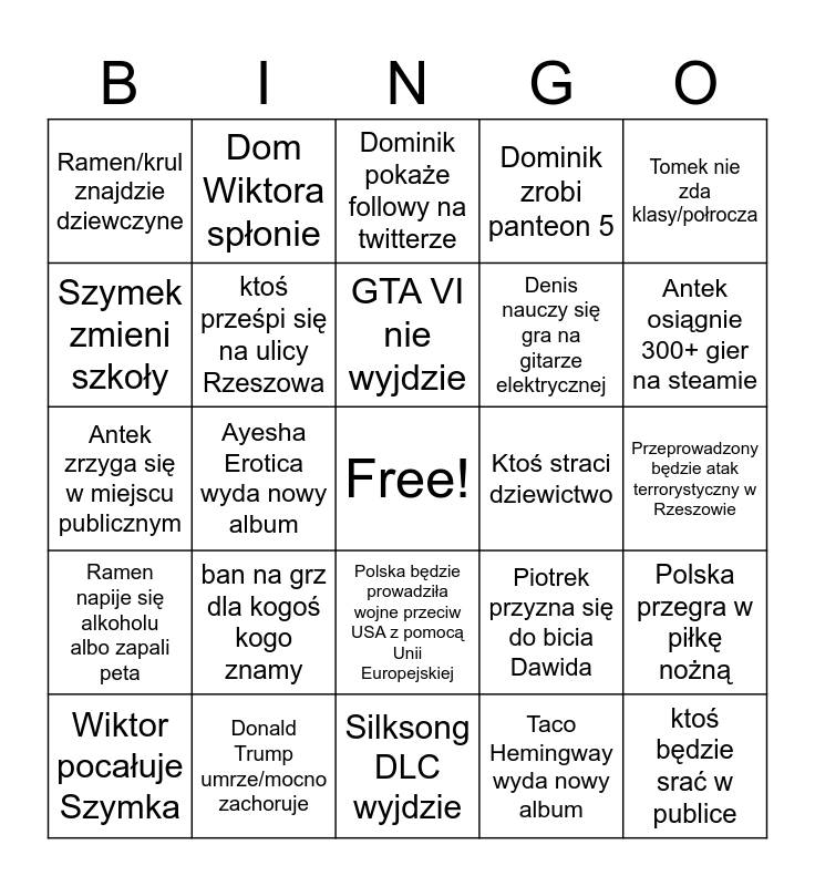 This bingo card has a free space and 24 words: ban na grz dla kogoś kogo znamy, Donald Trump umrze/mocno zachoruje, GTA VI nie wyjdzie, Wiktor pocałuje Szymka, Tomek nie zda klasy/połrocza, Ramen/krul znajdzie dziewczyne, Szymek zmieni szkoły, Dom Wiktora spłonie, Ktoś straci dziewictwo, Polska będzie prowadziła wojne przeciw USA z pomocą Unii Europejskiej, Denis nauczy się gra na gitarze elektrycznej, Antek zrzyga się w miejscu publicznym, Piotrek przyzna się do bicia Dawida, Polska przegra w piłkę nożną, ktoś prześpi się na ulicy Rzeszowa, Taco Hemingway wyda nowy album, Przeprowadzony będzie atak terrorystyczny w Rzeszowie, Dominik pokaże followy na twitterze, Antek osiągnie 300+ gier na steamie, Ayesha Erotica wyda nowy album, ktoś będzie srać w publice, Ramen napije się alkoholu albo zapali peta, Dominik zrobi panteon 5 and Silksong DLC wyjdzie.