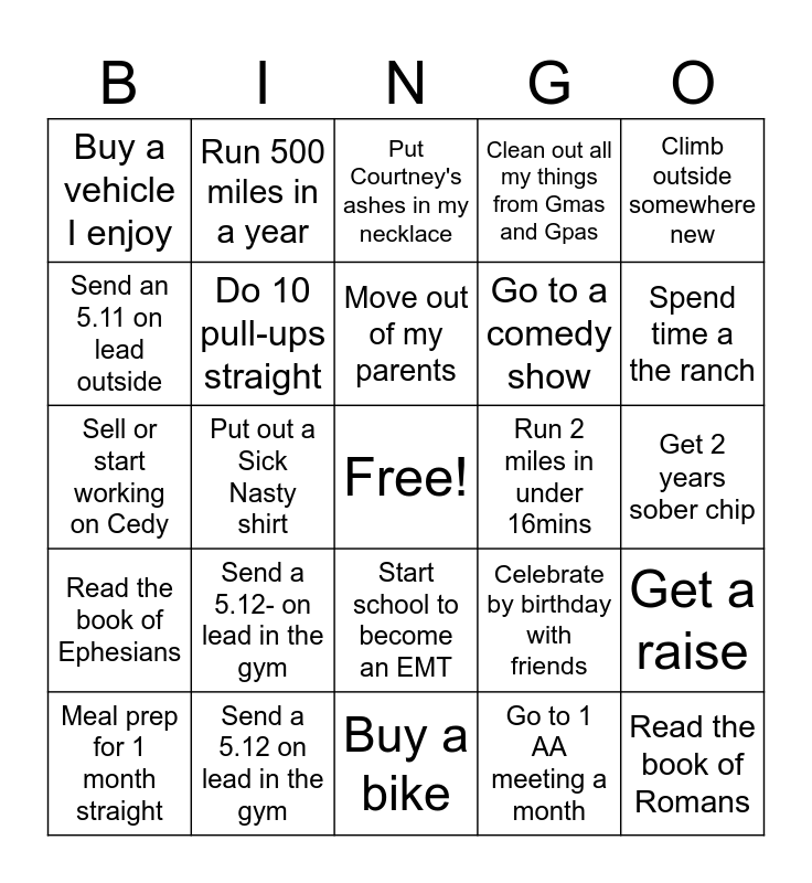 This bingo card has a free space and 24 words: Send a 5.12- on lead in the gym, Send a 5.12 on lead in the gym, Move out of my parents, Meal prep for 1 month straight, Climb outside somewhere new, Buy a vehicle I enjoy, Send an 5.11 on lead outside, Run 500 miles in a year, Run 2 miles in under 16mins, Start school to become an EMT, Go to a comedy show, Sell or start working on Cedy, Celebrate by birthday with friends, Get a raise, Do 10 pull-ups straight, Go to 1 AA meeting a month, Get 2 years sober chip, Put Courtney's ashes in my necklace, Spend time a the ranch, Put out a Sick Nasty shirt, Read the book of Romans, Read the book of Ephesians, Clean out all my things from Gmas and Gpas and Buy a bike.
