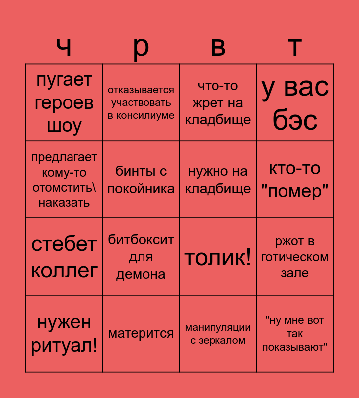 This bingo card has 16 words: матерится, ржот в готическом зале, что-то жрет на кладбище, пугает героев шоу, стебет коллег, отказывается участвовать в консилиуме, толик!, манипуляции с зеркалом, предлагает кому-то отомстить\ наказать, бинты с покойника, нужен ритуал!, у вас бэс, битбоксит для демона, кто-то "помер", нужно на кладбище and "ну мне вот так показывают".