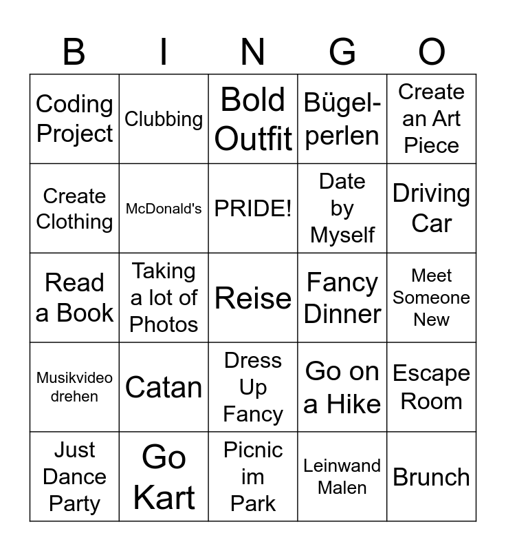 This bingo card has 25 words: Catan, Picnic im Park, PRIDE!, Just Dance Party, Create an Art Piece, Coding Project, Create Clothing, Clubbing, Fancy Dinner, Dress Up Fancy, Date by Myself, Read a Book, Go on a Hike, Escape Room, McDonald's, Brunch, Meet Someone New, Bold Outfit, Driving Car, Taking a lot of Photos, Reise, Go Kart, Musikvideo drehen, Bügel-perlen and Leinwand Malen.