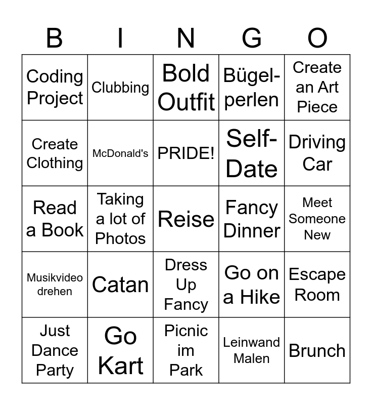 This bingo card has 25 words: Catan, Picnic im Park, PRIDE!, Just Dance Party, Create an Art Piece, Coding Project, Create Clothing, Clubbing, Fancy Dinner, Dress Up Fancy, Self-Date, Read a Book, Go on a Hike, Escape Room, McDonald's, Brunch, Meet Someone New, Bold Outfit, Driving Car, Taking a lot of Photos, Reise, Go Kart, Musikvideo drehen, Bügel-perlen and Leinwand Malen.