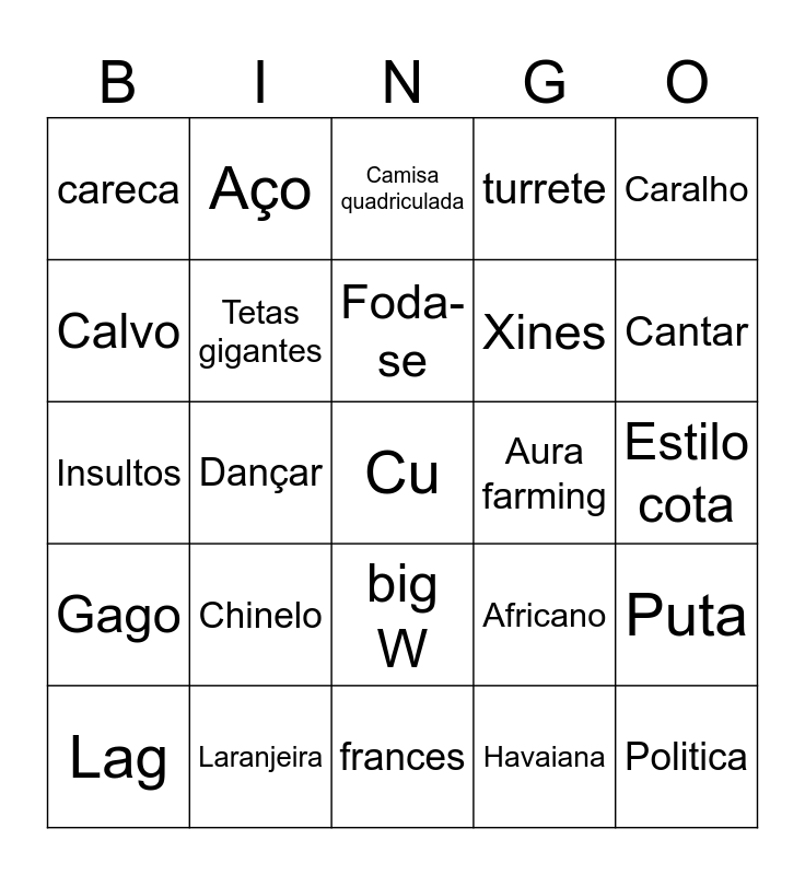 This bingo card has a free space and 24 words: Chinelo, Laranjeira, Foda-se, Lag, Caralho, careca, Calvo, Aço, Aura farming, big W, Xines, Insultos, Africano, Puta, Tetas gigantes, Havaiana, Estilo cota, Camisa quadriculada, Cantar, Dançar, Politica, Gago, turrete and frances.