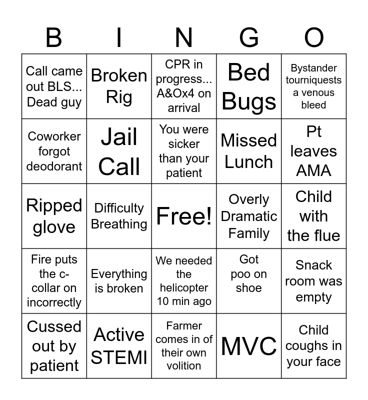 This bingo card has a free space and 29 words: Cussed out by patient, Used a backboard, Difficulty Breathing, Transfer, Call came out BLS... Dead guy, CPR in progress... A&Ox4 on arrival, Jail Call, Everything is broken, Overly Dramatic Family, Active STEMI, Child with the flue, Child coughs in your face, Farmer comes in of their own volition, MVC, Pt leaves AMA, Toe Pain, We needed the helicopter 10 min ago, Fire puts the c-collar on incorrectly, Bystander tourniquests a venous bleed, Ripped glove, Got poo on shoe, Pt attempted to engage in fisticuffs, Missed Lunch, Coworker forgot deodorant, Bed Bugs, Broken Rig, Snack room was empty, You were sicker than your patient and You were left speechless.