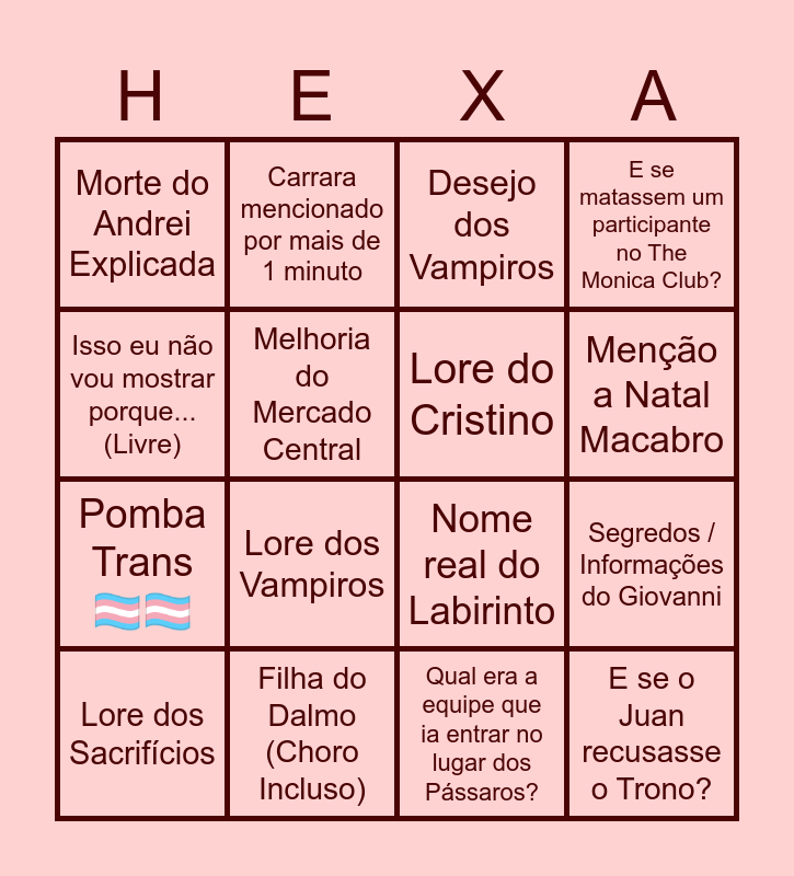 This bingo card has 16 words: Filha do Dalmo (Choro Incluso), Segredos / Informações do Giovanni, Desejo dos Vampiros, Morte do Andrei Explicada, Pomba Trans🏳️⚧️🏳️⚧️, Carrara mencionado por mais de 1 minuto, Nome real do Labirinto, Qual era a equipe que ia entrar no lugar dos Pássaros?, Isso eu não vou mostrar porque... (Livre), Melhoria do Mercado Central, Lore dos Sacrifícios, E se matassem um participante no The Monica Club?, Lore dos Vampiros, Menção a Natal Macabro, Lore do Cristino and E se o Juan recusasse o Trono?.