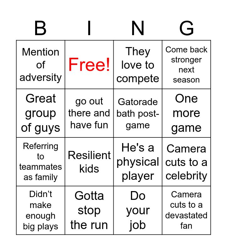 This bingo card has 16 words: Gotta stop the run, Camera cuts to a celebrity, They love to compete, Mention of adversity, Referring to teammates as family, Free!, He's a physical player, Do your job, Great group of guys, go out there and have fun, Didn’t make enough big plays, Come back stronger next season, Resilient kids, One more game, Gatorade bath post-game and Camera cuts to a devastated fan.