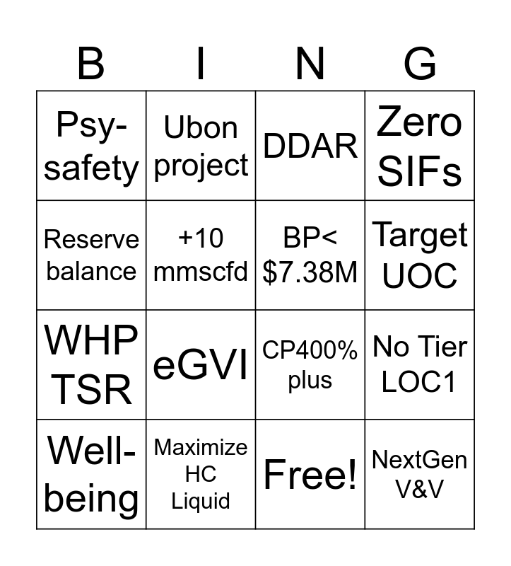This bingo card has 17 words: Free!, Well-being, DDAR, Psy-safety, eGVI, Zero SIFs, No Tier LOC1, BP< $7.38M, Target UOC, +10 mmscfd, Maximize HC Liquid, CP400% plus, Reserve balance, Ubon project, WHP TSR, In source project work and NextGen V&V.