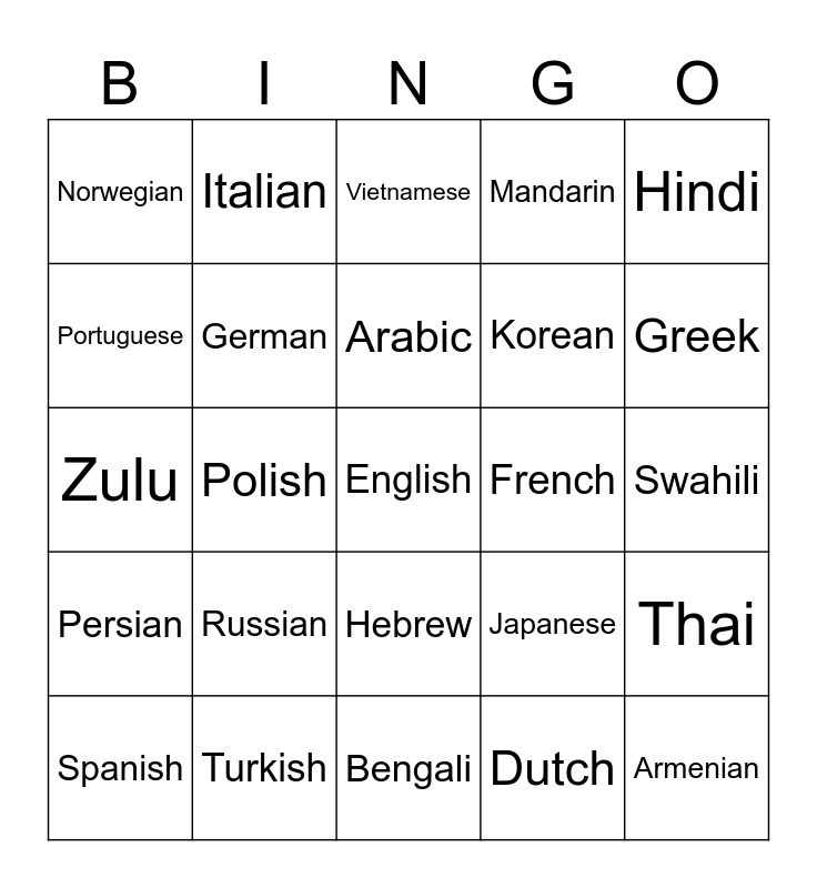 This bingo card has a free space and 24 words: Spanish, Russian, Arabic, Dutch, Hindi, Norwegian, Italian, Vietnamese, French, Swahili, Zulu, German, Japanese, Thai, Portuguese, Turkish, Bengali, Mandarin, Greek, Persian, Polish, Hebrew, Korean and Armenian.