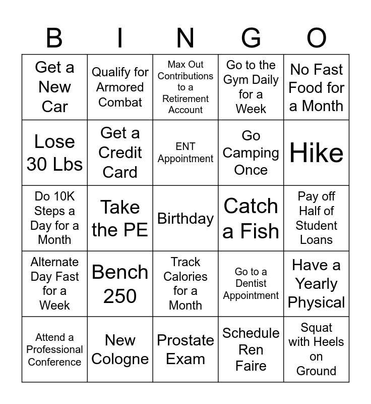 This bingo card has a free space and 24 words: Bench 250, New Cologne, ENT Appointment, Attend a Professional Conference, No Fast Food for a Month, Get a New Car, Lose 30 Lbs, Qualify for Armored Combat, Catch a Fish, Track Calories for a Month, Go Camping Once, Do 10K Steps a Day for a Month, Go to a Dentist Appointment, Have a Yearly Physical, Get a Credit Card, Schedule Ren Faire, Pay off Half of Student Loans, Max Out Contributions to a Retirement Account, Hike, Take the PE, Squat with Heels on Ground, Alternate Day Fast for a Week, Go to the Gym Daily for a Week and Prostate Exam.