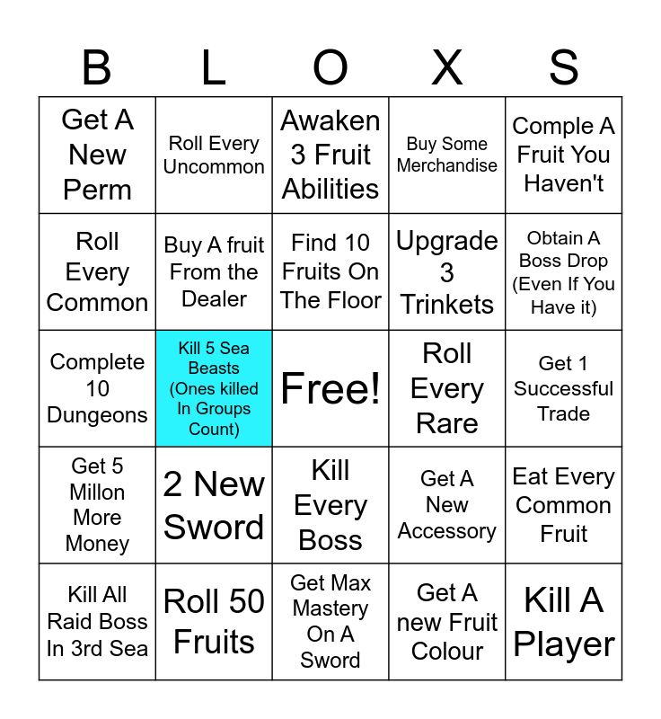 This bingo card has a free space and 24 words: 2 New Sword, Roll 50 Fruits, Find 10 Fruits On The Floor, Kill All Raid Boss In 3rd Sea, Comple A Fruit You Haven't, Get A New Perm, Roll Every Common, Roll Every Uncommon, Roll Every Rare, Kill Every Boss, Upgrade 3 Trinkets, Complete 10 Dungeons, Get A New Accessory, Eat Every Common Fruit, Buy A fruit From the Dealer, Get A new Fruit Colour, Get 1 Successful Trade, Awaken 3 Fruit Abilities, Obtain A Boss Drop (Even If You Have it), Kill 5 Sea Beasts (Ones killed In Groups Count), Kill A Player, Get 5 Millon More Money, Buy Some Merchandise and Get Max Mastery On A Sword.