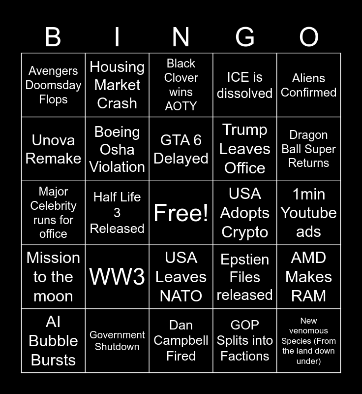 This bingo card has a free space and 24 words: WW3, Government Shutdown, GTA 6 Delayed, AI Bubble Bursts, Aliens Confirmed, Avengers Doomsday Flops, Unova Remake, Housing Market Crash, USA Adopts Crypto, USA Leaves NATO, Trump Leaves Office, Major Celebrity runs for office, Epstien Files released, AMD Makes RAM, Boeing Osha Violation, GOP Splits into Factions, 1min Youtube ads, Black Clover wins AOTY, Dragon Ball Super Returns, Half Life 3 Released, New venomous Species (From the land down under), Mission to the moon, ICE is dissolved and Dan Campbell Fired.