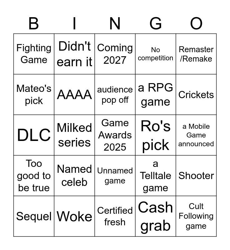 This bingo card has a free space and 24 words: Named celeb, Woke, audience pop off, Sequel, Remaster /Remake, Fighting Game, Mateo's pick, Didn't earn it, Ro's pick, Unnamed game, a RPG game, DLC, a Telltale game, Shooter, AAAA, Cash grab, a Mobile Game announced, Coming 2027, Crickets, Milked series, Cult Following game, Too good to be true, No competition and Certified fresh.