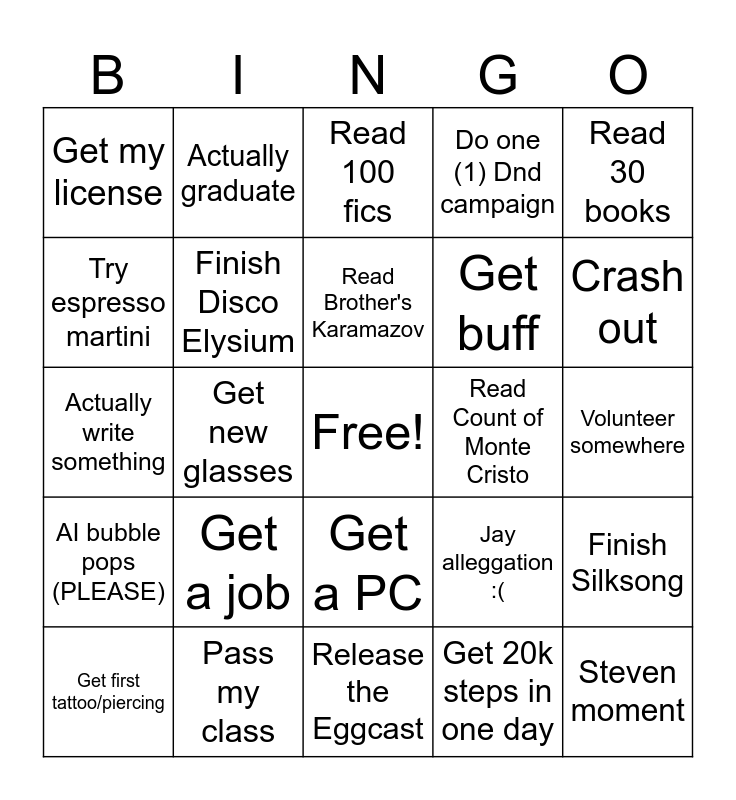 This bingo card has a free space and 24 words: Get a job, Pass my class, Read Brother's Karamazov, Get first tattoo/piercing, Read 30 books, Get my license, Try espresso martini, Actually graduate, Read Count of Monte Cristo, Get a PC, Get buff, Actually write something, Jay alleggation :(, Finish Silksong, Finish Disco Elysium, Get 20k steps in one day, Volunteer somewhere, Read 100 fics, Crash out, Get new glasses, Steven moment, AI bubble pops (PLEASE), Do one (1) Dnd campaign and Release the Eggcast.
