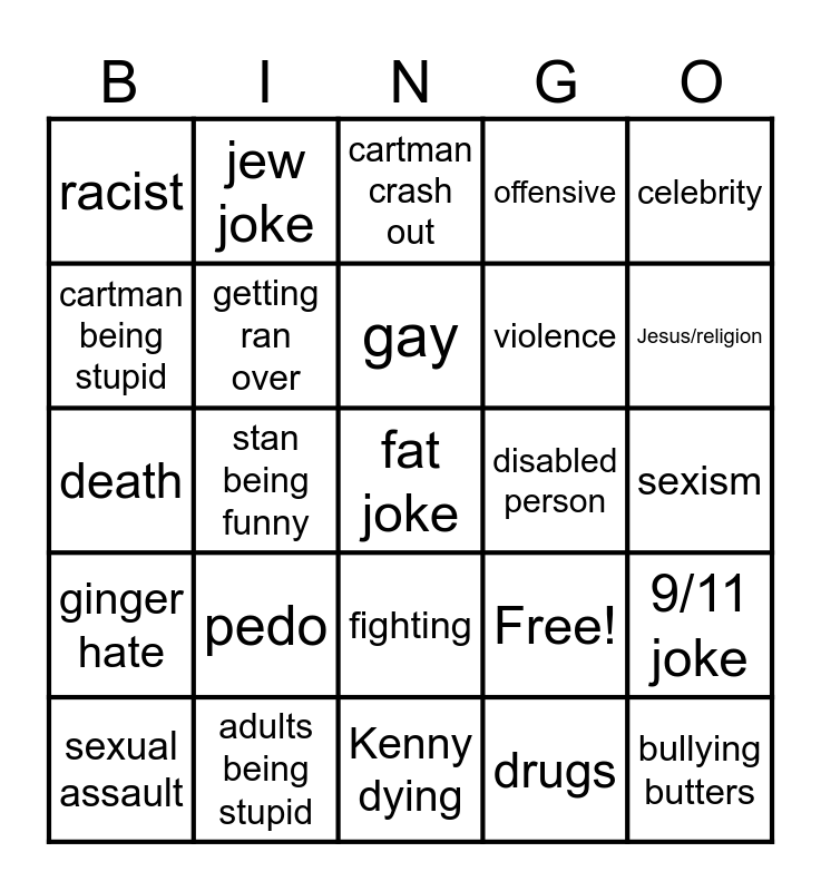 This bingo card has 25 words: pedo, Kenny dying, gay, sexual assault, celebrity, racist, cartman being stupid, jew joke, disabled person, fighting, violence, death, Free!, 9/11 joke, getting ran over, bullying butters, sexism, cartman crash out, Jesus/religion, stan being funny, fat joke, adults being stupid, ginger hate, offensive and drugs.