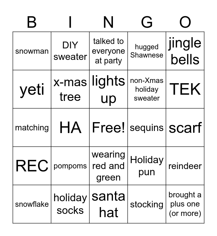 This bingo card has a free space and 24 words: pompoms, holiday socks, lights up, snowflake, jingle bells, snowman, yeti, DIY sweater, sequins, wearing red and green, non-Xmas holiday sweater, matching, Holiday pun, reindeer, x-mas tree, stocking, scarf, talked to everyone at party, TEK, HA, brought a plus one (or more), REC, hugged Shawnese and santa hat.