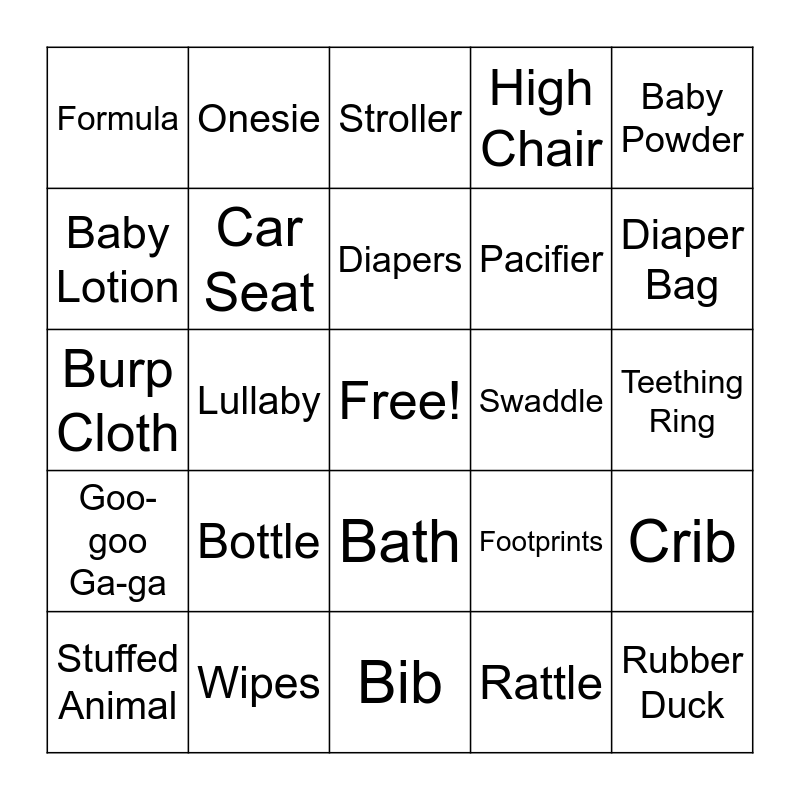 This bingo card has a free space and 24 words: Bottle, Wipes, Diapers, Stuffed Animal, Baby Powder, Formula, Baby Lotion, Onesie, Swaddle, Bath, Pacifier, Burp Cloth, Footprints, Crib, Car Seat, Rattle, Teething Ring, Stroller, Diaper Bag, Lullaby, Rubber Duck, Goo-goo Ga-ga, High Chair and Bib.
