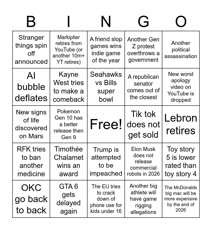 This bingo card has a free space and 24 words: Timothée Chalamet wins an award, GTA 6 gets delayed again, Seahawks vs Bills super bowl, OKC go back to back, Another political assassination, Stranger things spin off announced, AI bubble deflates, Markiplier retires from YouTube (or another 10m+ YT retires), Tik tok does not get sold, Trump is attempted to be impeached, A republican senator comes out of the closest, New signs of life discovered on Mars, Elon Musk does not release commercial robots in 2026, Toy story 5 is lower rated than toy story 4, Kayne West tries to make a comeback, Another big athlete will have game rigging allegations, Lebron retires, A friend slop games wins indie game of the year, New worst apology video on YouTube is dropped, Pokemon Gen 10 has a better release then Gen 9, The McDonalds big mac will be more expensive by the end of 2026, RFK tries to ban another medicine, Another Gen Z protest overthrows a government and The EU tries to crack down of phone use for kids under 16.