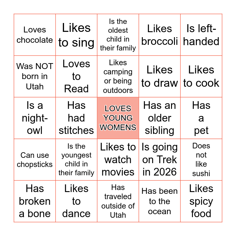This bingo card has a free space and 40 words: Have ridden a horse, Is a night-owl, Likes to play video games, Loves to Read, Likes to dance, Likes to watch movies, Likes camping or being outdoors, Plays a musical instrument, Is left-handed, Can use chopsticks, Has had stitches, Likes broccoli, Likes spicy food, Has a pet, Has an older sibling, Is the youngest child in their family, Favorite color is the same as yours, Loves chocolate, Likes pineapple on pizza, Is the oldest child in their family, Does not like sushi, Has been to the ocean, Likes to draw, Was NOT born in Utah, Has a nick-name, Likes to do crafts, Has a younger sibling, Has given a talk in Sacrament Meeting, Likes school, Doesn't like school, Knows how to whistle, Has broken a bone, Likes to play card games, Is going on Trek in 2026, Likes to cook, Has traveled outside of Utah, Has read The Book of Mormon, Is EXCITED for Girl's Camp 2026, Likes to sing and Likes mornings.