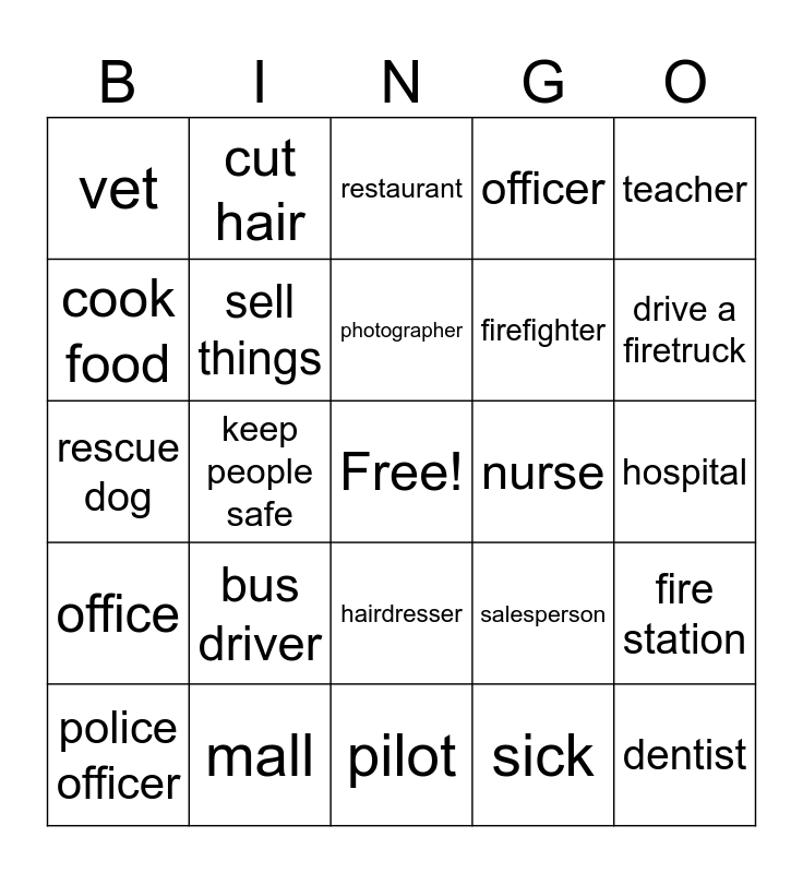 This bingo card has a free space and 25 words: bus driver, pilot, photographer, police officer, teacher, vet, cook food, cut hair, nurse, hairdresser, firefighter, rescue dog, salesperson, fire station, sell things, fix teeth, hospital, restaurant, drive a firetruck, keep people safe, dentist, mall, office, officer and sick.