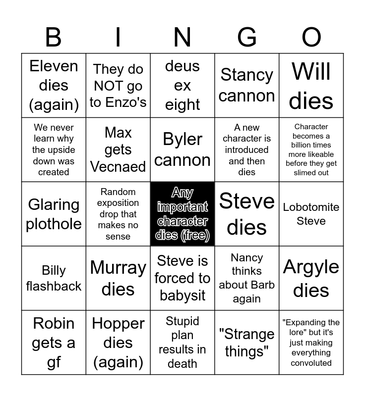 This bingo card has a free space and 24 words: Murray dies, Hopper dies (again), Byler cannon, Robin gets a gf, Will dies, Eleven dies (again), We never learn why the upside down was created, They do NOT go to Enzo's, Steve dies, Steve is forced to babysit, A new character is introduced and then dies, Glaring plothole, Nancy thinks about Barb again, Argyle dies, Max gets Vecnaed, "Strange things", Lobotomite Steve, deus ex eight, Character becomes a billion times more likeable before they get slimed out, Random exposition drop that makes no sense, "Expanding the lore" but it's just making everything convoluted, Billy flashback, Stancy cannon and Stupid plan results in death.