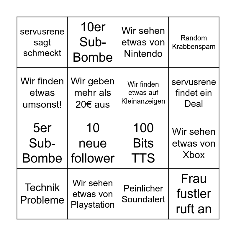 This bingo card has 16 words: Wir sehen etwas von Playstation, Wir sehen etwas von Xbox, Wir sehen etwas von Nintendo, servusrene sagt schmeckt, 5er Sub-Bombe, 10er Sub-Bombe, 100 Bits TTS, Peinlicher Soundalert, Wir finden etwas umsonst!, Wir geben mehr als 20€ aus, Technik Probleme, Random Krabbenspam, 10 neue follower, servusrene findet ein Deal, Wir finden etwas auf Kleinanzeigen and Frau fustler ruft an.