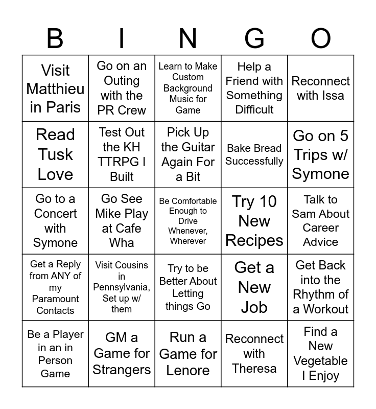 This bingo card has 25 words: Visit Cousins in Pennsylvania, Set up w/ them, Run a Game for Lenore, Pick Up the Guitar Again For a Bit, Be a Player in an in Person Game, Reconnect with Issa, Visit Matthieu in Paris, Read Tusk Love, Go on an Outing with the PR Crew, Try 10 New Recipes, Try to be Better About Letting things Go, Bake Bread Successfully, Go to a Concert with Symone, Get a New Job, Get Back into the Rhythm of a Workout, Test Out the KH TTRPG I Built, Find a New Vegetable I Enjoy, Talk to Sam About Career Advice, Learn to Make Custom Background Music for Game, Go on 5 Trips w/ Symone, Go See Mike Play at Cafe Wha, Be Comfortable Enough to Drive Whenever, Wherever, GM a Game for Strangers, Get a Reply from ANY of my Paramount Contacts, Help a Friend with Something Difficult and Reconnect with Theresa.