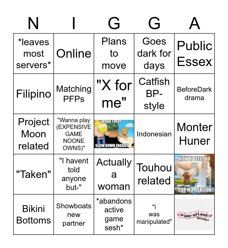 This bingo card has 2 images, a free space and 22 words: "I havent told anyone but-", Showboats new partner, "X for me", Bikini Bottoms, Public Essex, *leaves most servers*, Filipino, Online, Indonesian, Actually a woman, Catfish BP-style, Project Moon related, Touhou related, Matching PFPs, "i was manipulated", Monter Huner, Plans to move, BeforeDark drama, "Wanna play (EXPENSIVE GAME NOONE OWNS)", "Taken", Goes dark for days and *abandons active game sesh*.