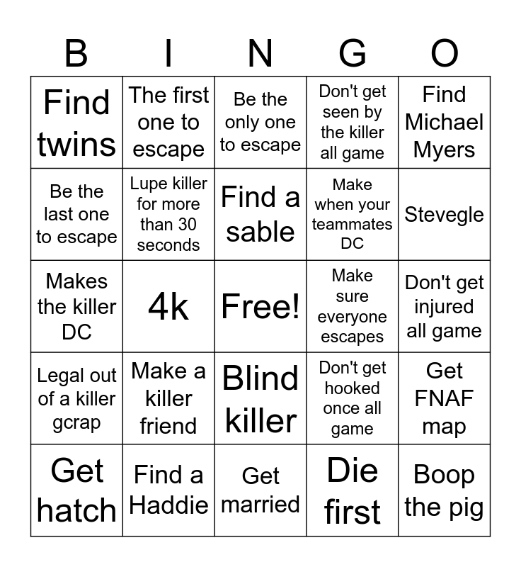 This bingo card has a free space and 24 words: Make a killer friend, Find a Haddie, Find a sable, Get hatch, Find Michael Myers, Find twins, Be the last one to escape, The first one to escape, Make sure everyone escapes, Blind killer, Make when your teammates DC, Makes the killer DC, Don't get hooked once all game, Get FNAF map, Lupe killer for more than 30 seconds, Die first, Don't get injured all game, Be the only one to escape, Stevegle, 4k, Boop the pig, Legal out of a killer gcrap, Don't get seen by the killer all game and Get married.
