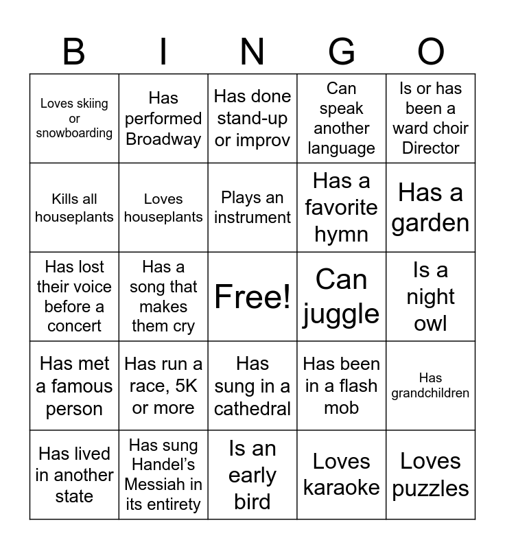 This bingo card has a free space and 24 words: Has run a race, 5K or more, Has sung Handel’s Messiah in its entirety, Plays an instrument, Has lived in another state, Is or has been a ward choir Director, Loves skiing or snowboarding, Kills all houseplants, Has performed Broadway, Can juggle, Has sung in a cathedral, Has a favorite hymn, Has lost their voice before a concert, Has been in a flash mob, Has grandchildren, Loves houseplants, Loves karaoke, Is a night owl, Has done stand-up or improv, Has a garden, Has a song that makes them cry, Loves puzzles, Has met a famous person, Can speak another language and Is an early bird.