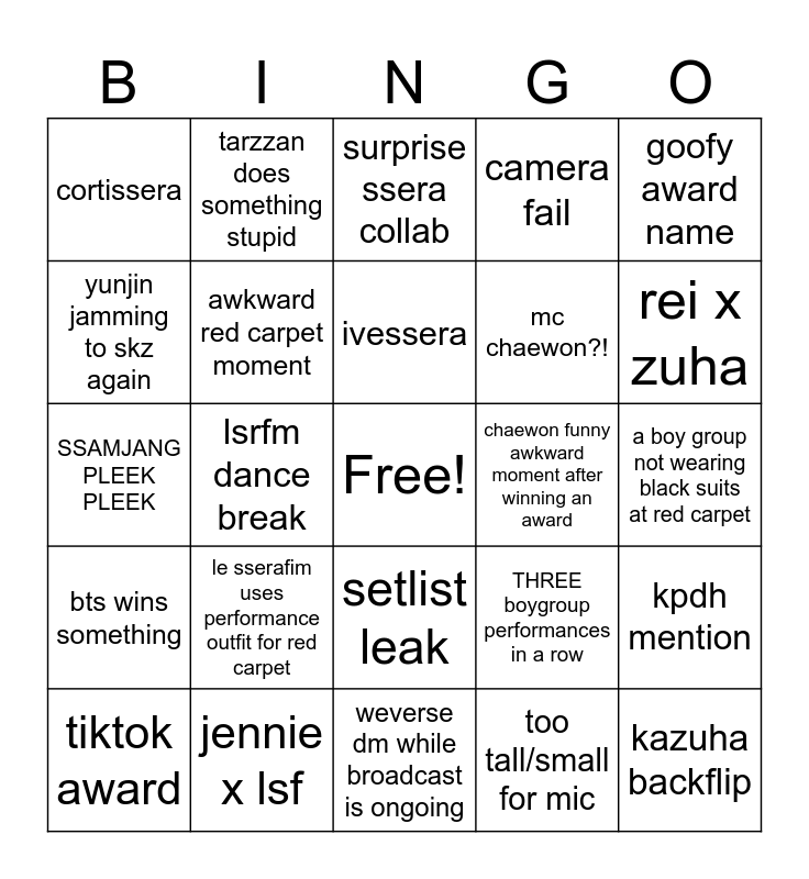 This bingo card has a free space and 24 words: le sserafim uses performance outfit for red carpet, jennie x lsf, ivessera, tiktok award, goofy award name, cortissera, yunjin jamming to skz again, tarzzan does something stupid, chaewon funny awkward moment after winning an award, setlist leak, mc chaewon?!, SSAMJANG PLEEK PLEEK, THREE boygroup performances in a row, kpdh mention, awkward red carpet moment, too tall/small for mic, a boy group not wearing black suits at red carpet, surprise ssera collab, rei x zuha, lsrfm dance break, kazuha backflip, bts wins something, camera fail and weverse dm while broadcast is ongoing.