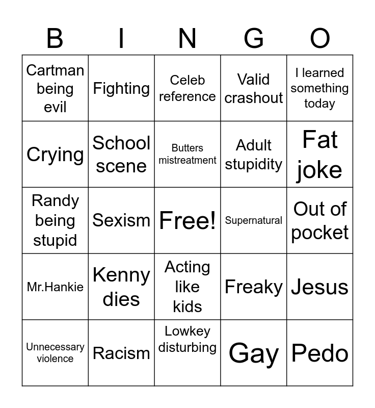 This bingo card has a free space and 24 words: Kenny dies, Racism, Butters mistreatment, Unnecessary violence, I learned something today, Cartman being evil, Crying, Fighting, Supernatural, Acting like kids, Adult stupidity, Randy being stupid, Freaky, Jesus, School scene, Gay, Out of pocket, Celeb reference, Fat joke, Sexism, Pedo, Mr.Hankie, Valid crashout and Lowkey disturbing.