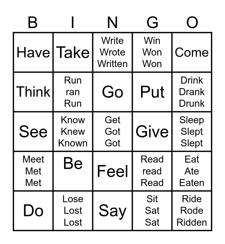 This bingo card has 25 words: Be, Say, Go, Do, Come, Have, Think, Take, Give, Feel, Put, See, Read read Read, Eat Ate Eaten, Run ran Run, Ride Rode Ridden, Sleep Slept Slept, Write Wrote Written, Drink Drank Drunk, Know Knew Known, Get Got Got, Lose Lost Lost, Meet Met Met, Win Won Won and Sit Sat Sat.