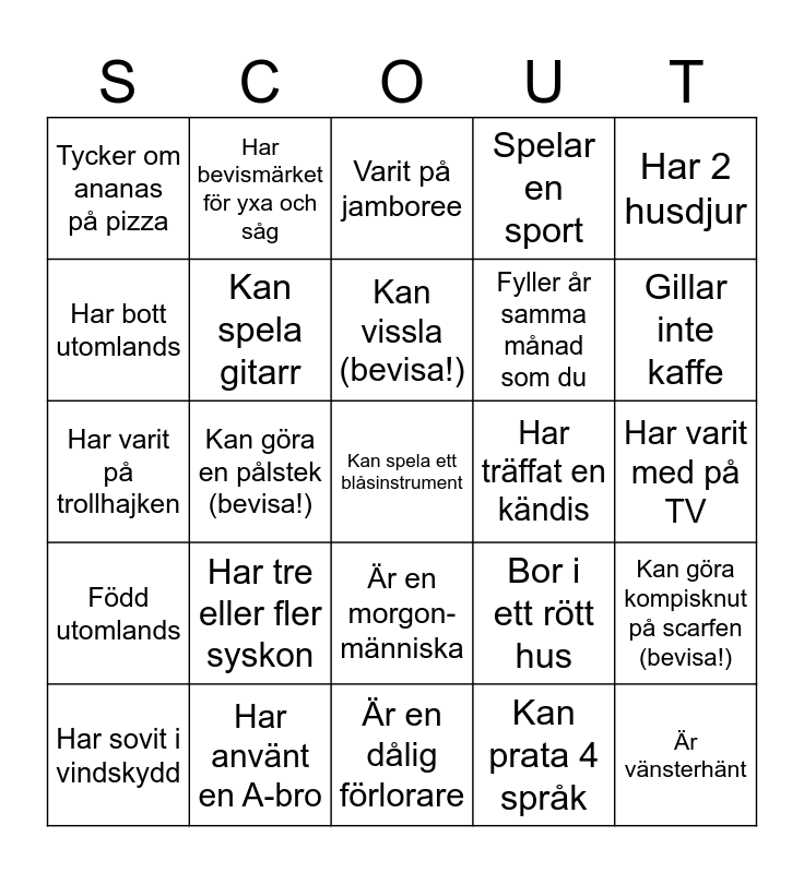 This bingo card has a free space and 24 words: Har tre eller fler syskon, Har använt en A-bro, Kan vissla (bevisa!), Har sovit i vindskydd, Har 2 husdjur, Tycker om ananas på pizza, Har bott utomlands, Har bevismärket för yxa och såg, Har träffat en kändis, Är en morgon-människa, Fyller år samma månad som du, Har varit på trollhajken, Bor i ett rött hus, Kan göra kompisknut på scarfen (bevisa!), Kan spela gitarr, Kan prata 4 språk, Har varit med på TV, Varit på jamboree, Gillar inte kaffe, Kan göra en pålstek (bevisa!), Är vänsterhänt, Född utomlands, Spelar en sport and Är en dålig förlorare.