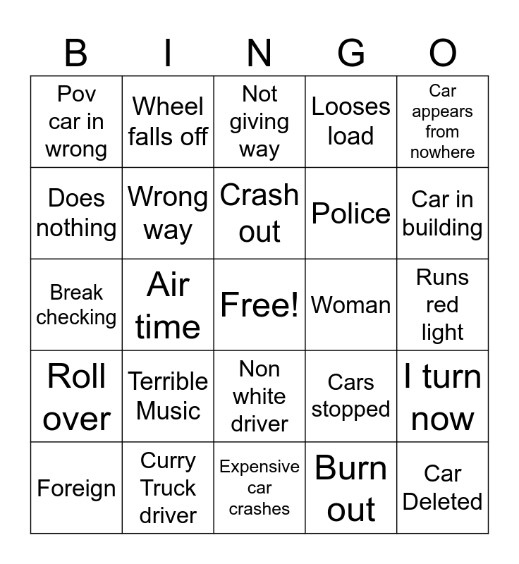 This bingo card has a free space and 24 words: Terrible Music, Curry Truck driver, Crash out, Foreign, Car appears from nowhere, Pov car in wrong, Does nothing, Wheel falls off, Woman, Non white driver, Police, Break checking, Cars stopped, I turn now, Wrong way, Burn out, Runs red light, Not giving way, Car in building, Air time, Car Deleted, Roll over, Looses load and Expensive car crashes.