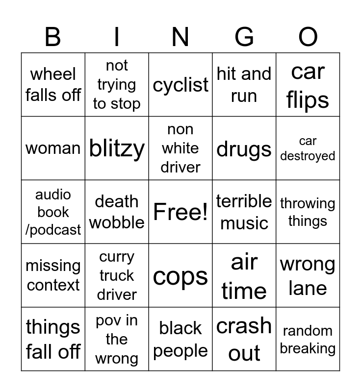 This bingo card has a free space and 24 words: curry truck driver, pov in the wrong, non white driver, things fall off, car flips, wheel falls off, woman, not trying to stop, terrible music, cops, drugs, audio book /podcast, air time, wrong lane, blitzy, crash out, throwing things, cyclist, car destroyed, death wobble, random breaking, missing context, hit and run and black people.