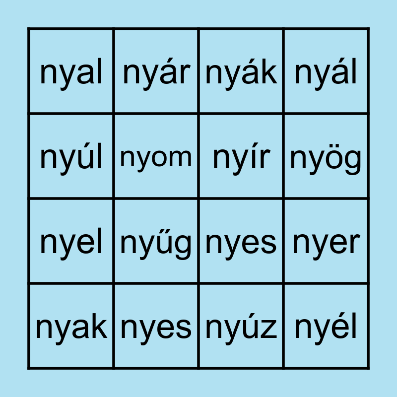 This bingo card has 16 words: nyes, nyer, nyák, nyal, nyel, nyár, nyes, nyúz, nyúl, nyom, nyak, nyál, nyűg, nyög, nyír and nyél.