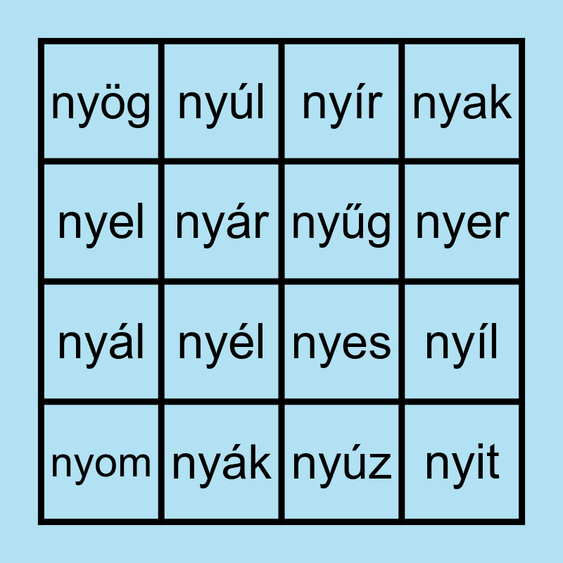 This bingo card has 16 words: nyák, nyíl, nyír, nyög, nyál, nyúl, nyes, nyúz, nyel, nyár, nyom, nyak, nyél, nyer, nyűg and nyit.